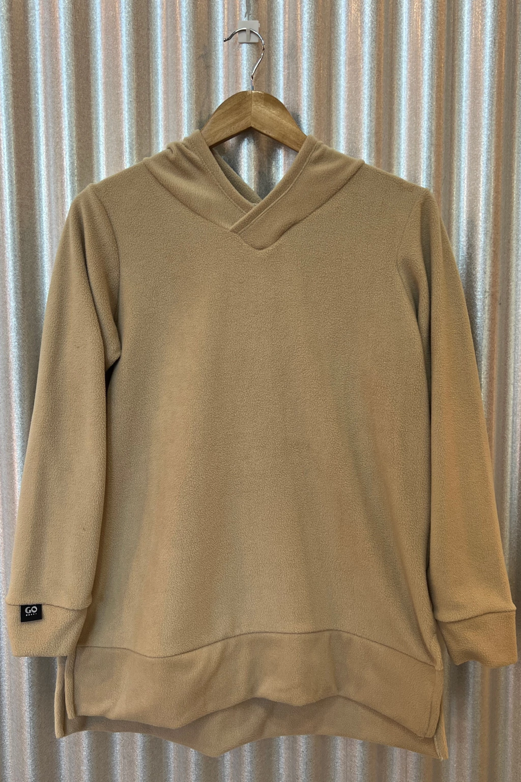 Buzo de Micropolar con capucha y tajos a los costados. Largo debajo de la cadera